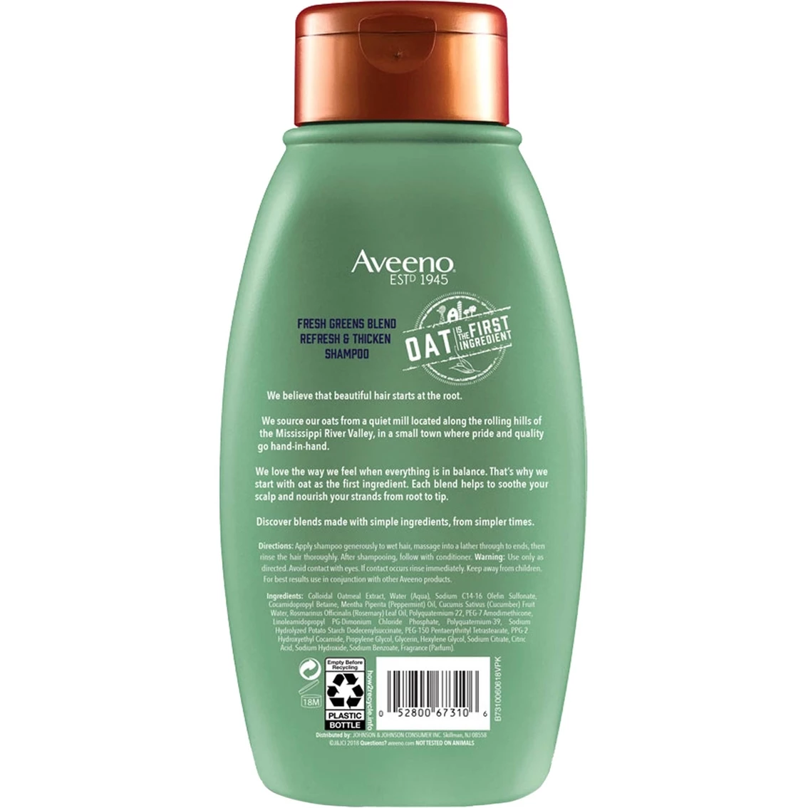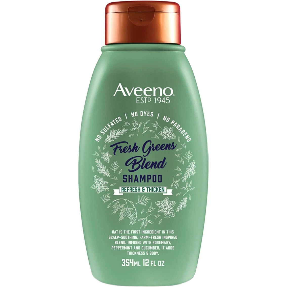 Oat is the first ingredient in this scalp-soothing, farm-fresh inspired Aveeno shampoo infused with rosemary, peppermint and cucumber for thickness and body. Sulfate free shampoo, no dyes or parabens.