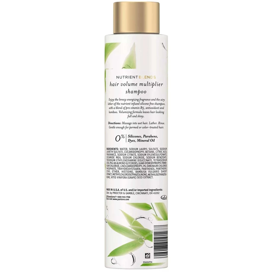Pantene NutrientBlends Hair Volume Multiplier Silicone Free Shampoo is great for fine, thin hair or simply hair that falls flat throughout the day. This cleansing and volumizing shampoo to remove dirt and oils that can weigh hair down, adding body and fullness. Plus, it’s gentle enough for permed or color treated hair. This shampoo is great for fine hair and provides bountiful volume for vibrant body, leaving your hair touchably soft. Enjoy the breezy energizing fragrance and the airy lather of the nutrient-infused silicone free shampoo with a blend of pro vitamin B5, antioxidants and bamboo. The volumizing formula leaves hair looking full and shiny. Size: 9.6 oz.