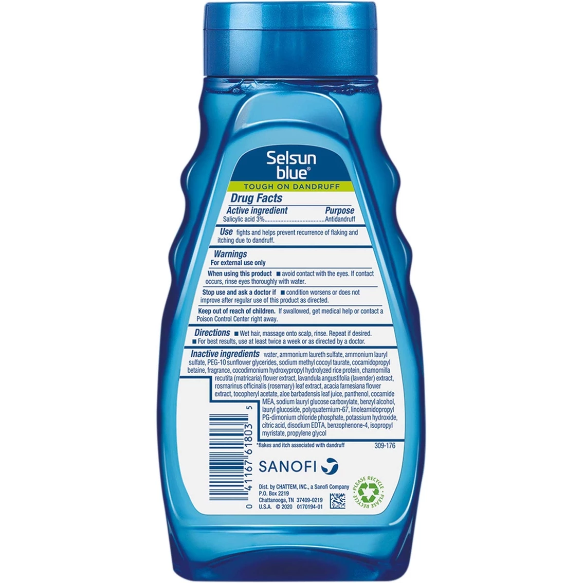 The extra-hydrating formula cleans and moisturizes to help relieve dry scalp. This shampoo helps prevent and eliminate itchy scalp and visible flakes associated with dandruff. Stock up on 11 oz. bottles of Selsun Blue Dandruff Shampoo so you always have it on hand. Directions for Use: Shampoo, then rinse thoroughly For best results, use at least twice a week or as directed by a doctor. About Selsun Blue: Selsun Blue is the expert in scalp health, offering high-quality, effective solutions that are tough on dandruff and great for hair to help you feel confident, poised and in control. Selsun Blue helps control dandruff by powerfully relieving symptoms like flaking and itching. Say ‘goodbye’ to flakes and ditch your dandruff with Selsun Blue!